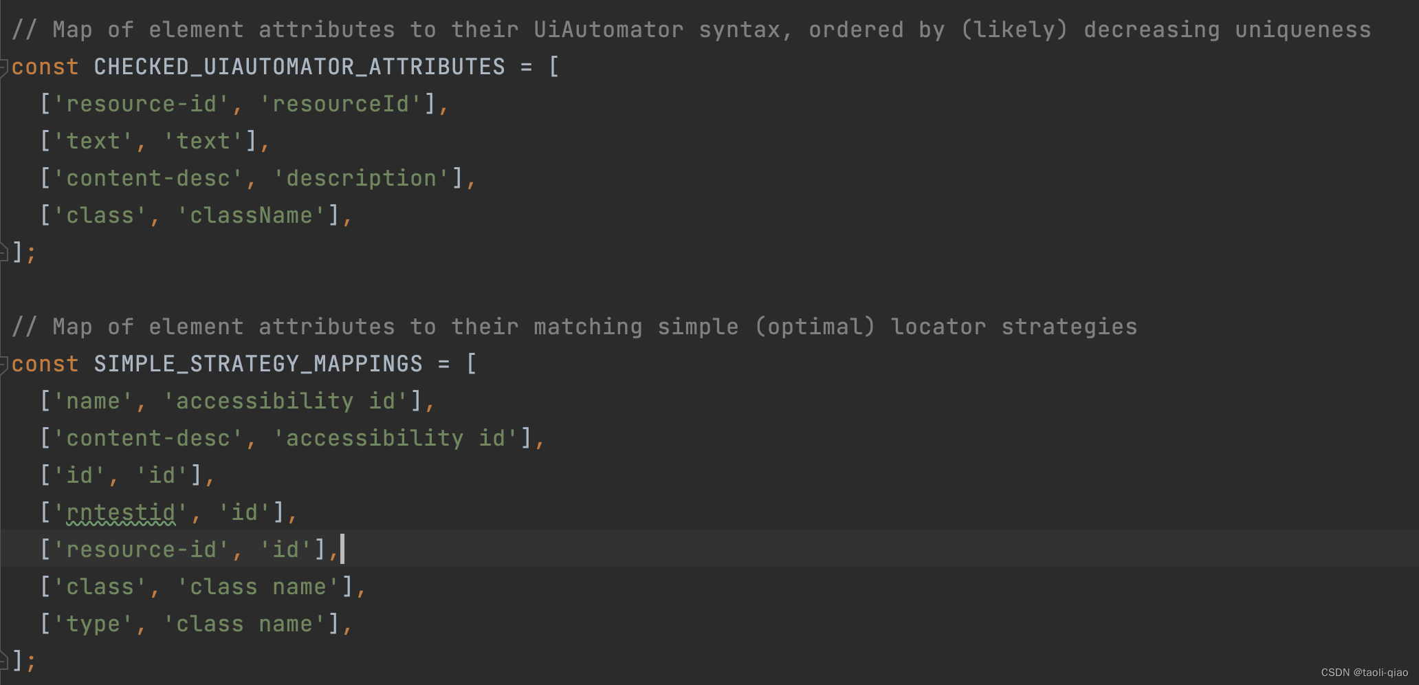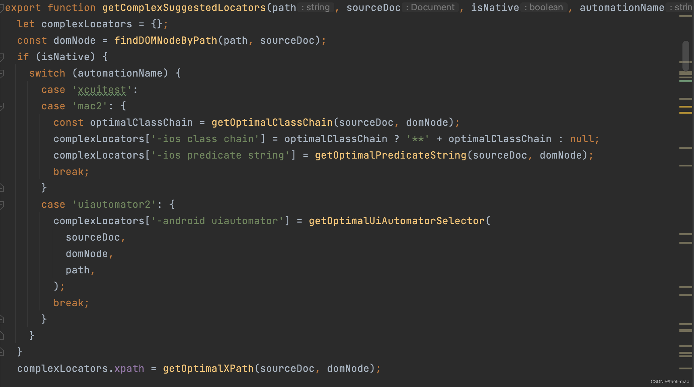 除了上面的一些关键source code,当用户点击页面的某个element的时候,会在appium-inspector中显示生成的selector,这个是如何实现的呢?在utils目录下有个locator-generation.js文件,里面有getSuggestedLocactor方法,里面调用了getSimpleSuggestedLocators和getComplexSuggestedLocators方法,再将获取的locator进行对比选取合理的locator。