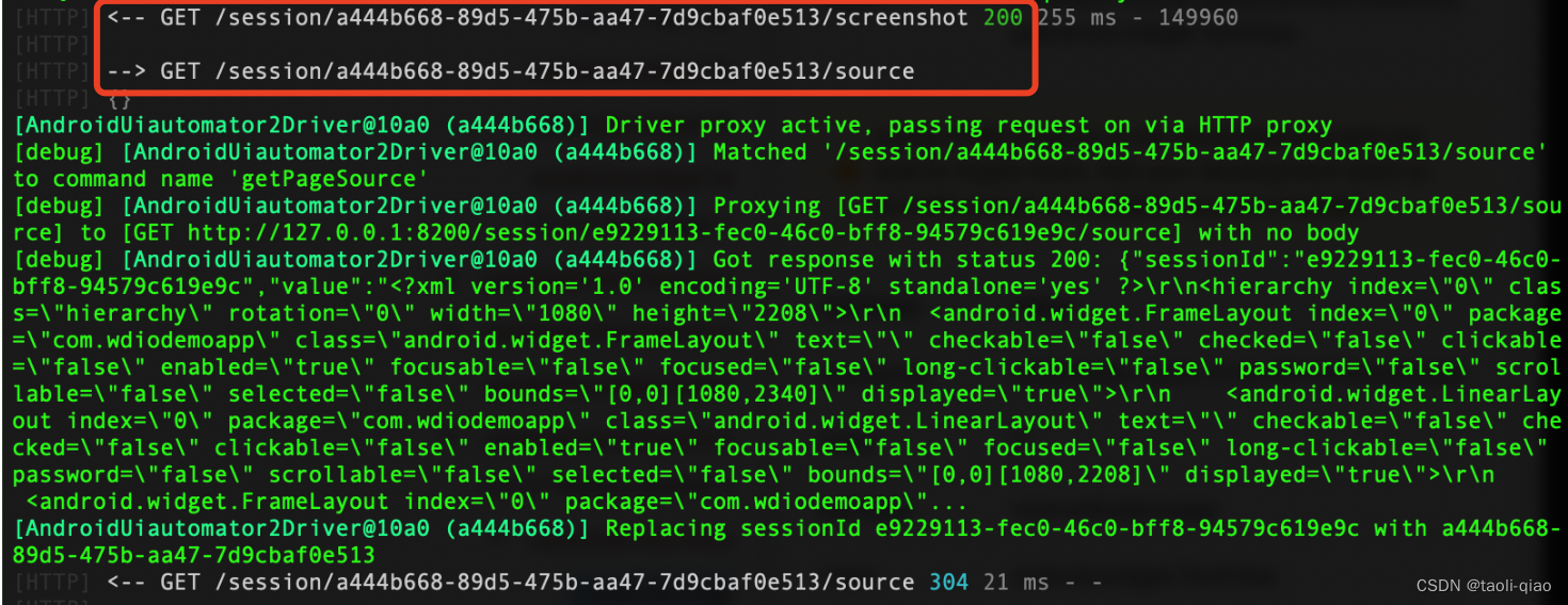 当用appium-inspector连接到appium server时,可以在appium server的日志中看到如下信息,可以看到调用了appium server的接口获取screenshot信息和page source信息。screenshot就是用来显示mobile app UI的。