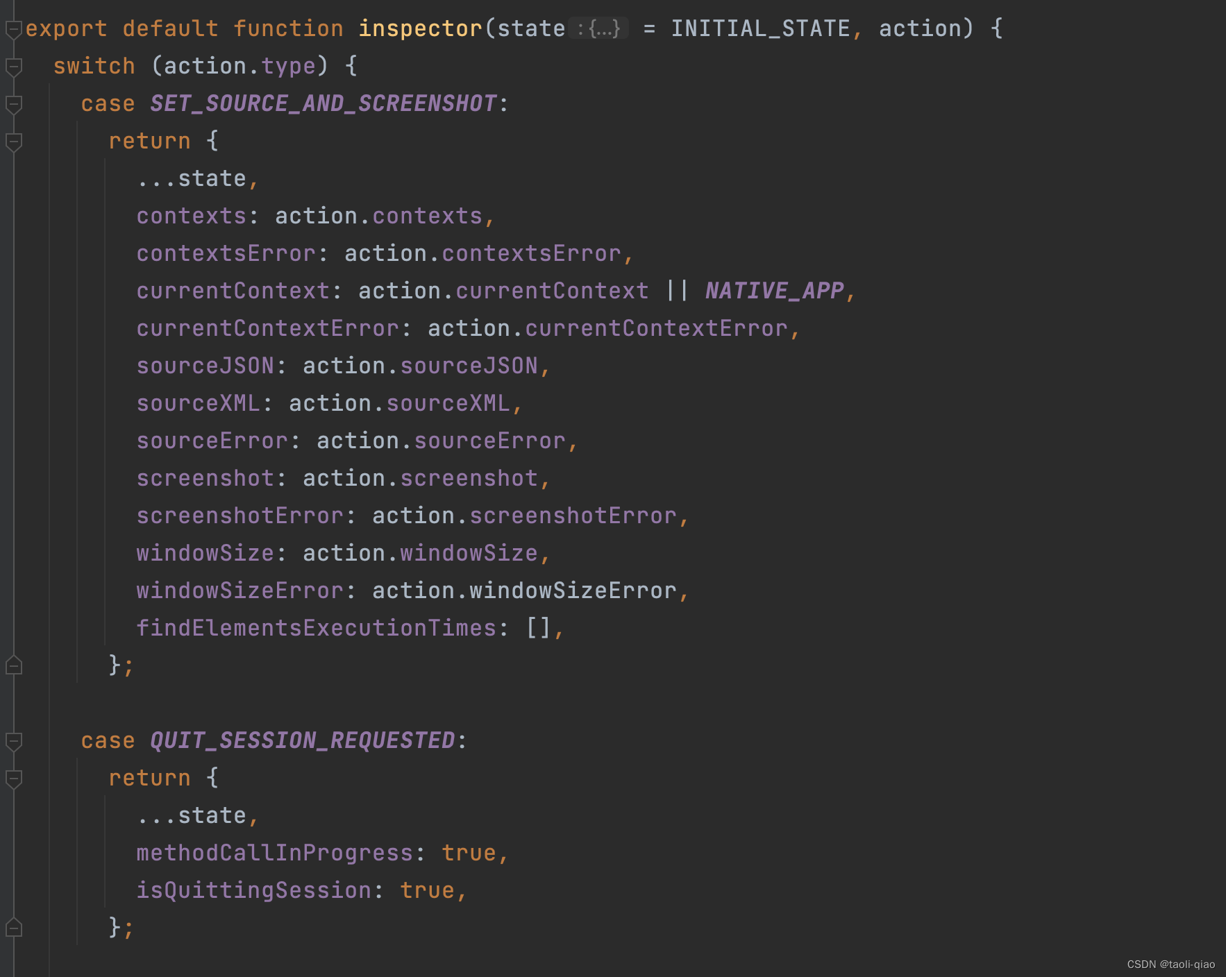 以reducers目录下Inspector.js为例,接受action.type,来更新state信息。