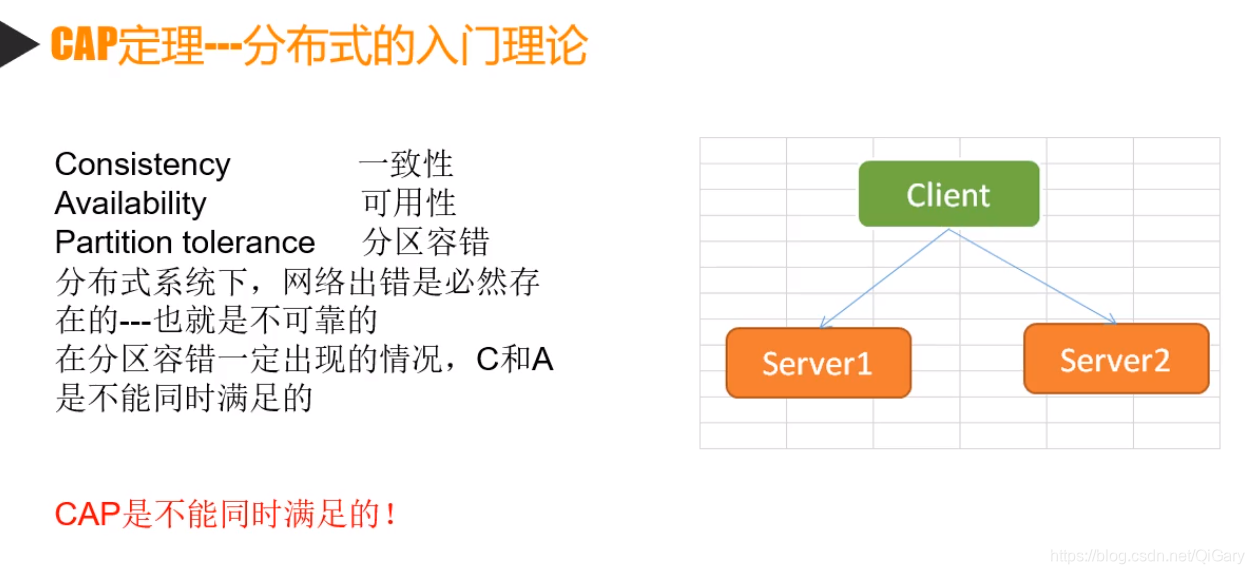 Partition tolerance(分区容错):分布式系统在长期运行的情况下,必然出错,是不可靠的。