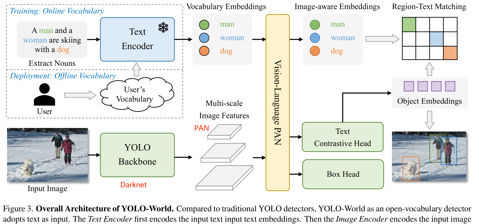 文本编码器将输入文本转换为文本嵌入,图像编码器(也就是YOLO Backbone)从输入图像中提取多尺度特征,然后利用RepVL-PAN通过利用图像特征和文本嵌入之间的跨模态融合来增强文本和图像的表示,最后YOLO-World预测回归的边界框和目标嵌入,以匹配输入文本中出现的类别或名词。