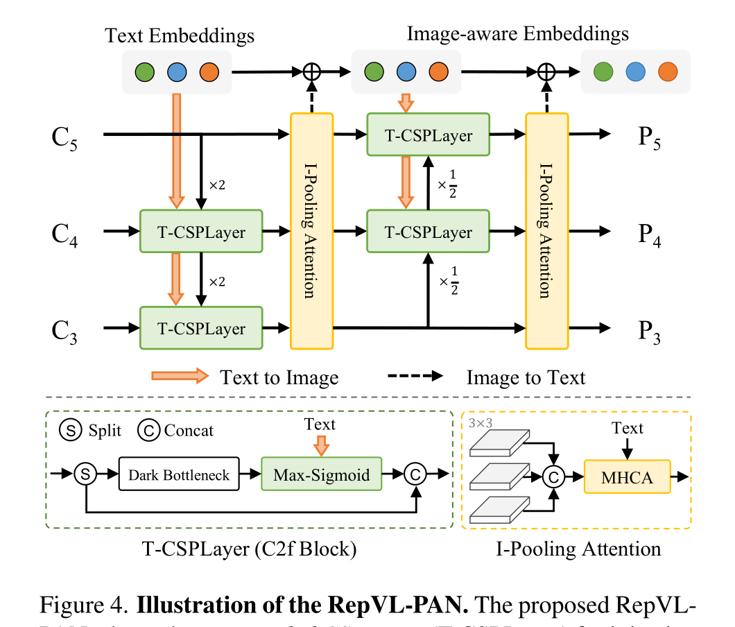 提出的RepVL-PAN采用文本引导CSPLayer(T-CSPLayer)将语言信息注入图像特征,并采用图像池化注意力(I-Pooling Attention)增强图像感知文本嵌入