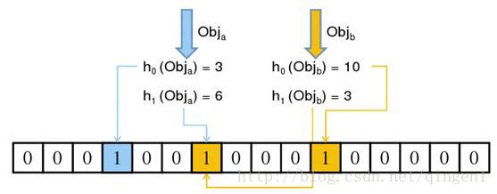 图2表示m=16,k=2的Bloom Filter,和的哈希值分别为(3, 6)和(10, 3)。
