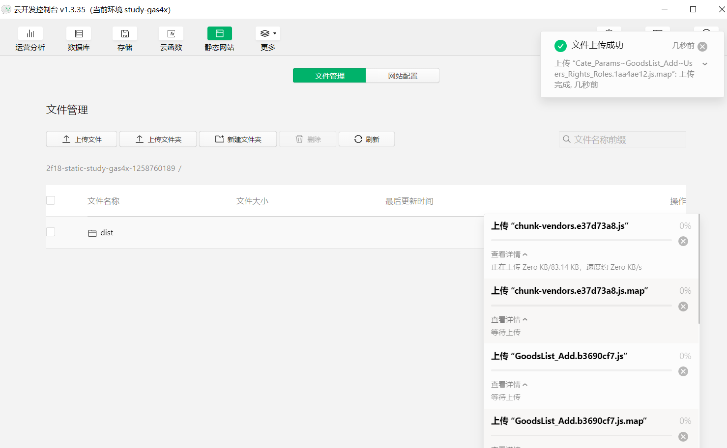 部署其实很简单, 就是把打包好的文件直接上传到云开发静态网站即可。