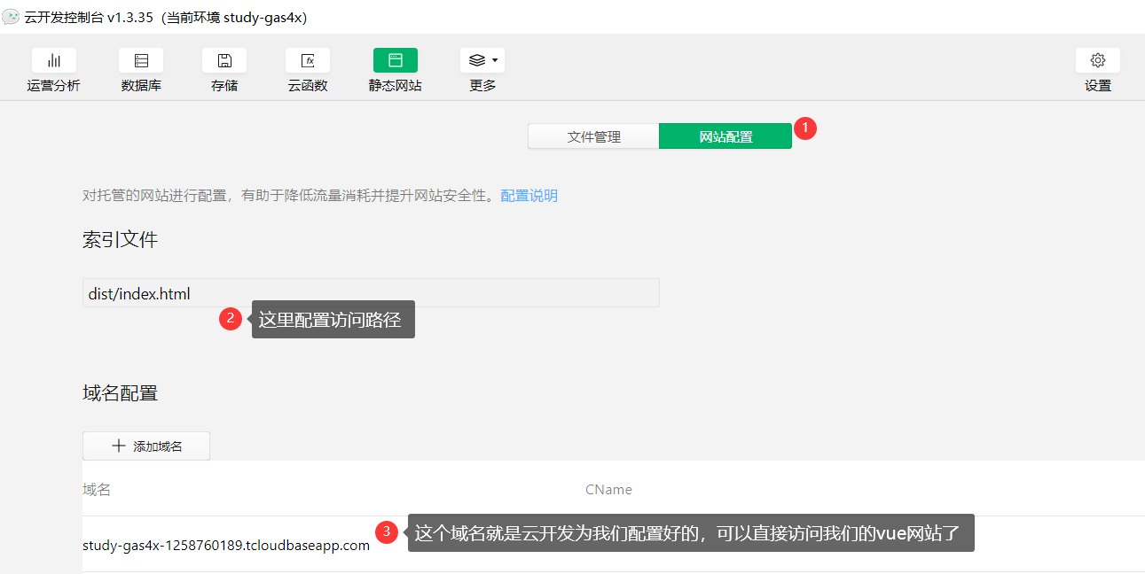 study-gas4x-1258760189.tcloudbaseapp.com 就是云开发为我分配的网站域名,以后用户就可以直接通过这个域名访问我们的网站了。