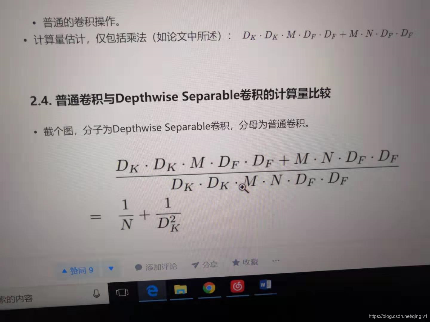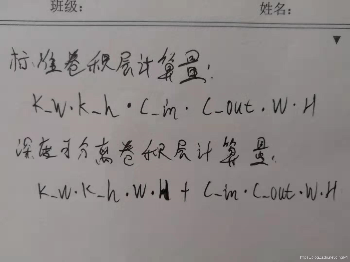 假设输入特征图大小为 D_F×D_F×M,输出特征图大小为 D_F×D_F×N,卷积核大小为 D_K×D_K,则传统卷积的计算量为: