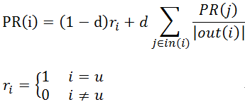 用user节点和item节点替换上面的网页节点就可以计算出每个user,每个item在全局的重要性,给出全局的排名,显然这并不是我们想要的,我们需要计算的是物品节点相对于某一个用户节点u的相关性。怎么做呢?Standford的Haveliwala于2002年在他《Topic-sensitive pagerank》一文中提出了PersonalRank算法,该算法能够为用户个性化的对所有物品进行排序。它的迭代公式如下: