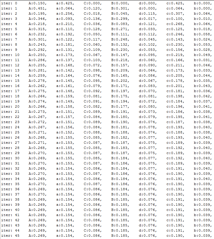 上面的代码是对本文一开始描述的数据集中的用户A进行推荐。上图给出了不同迭代次数后各节点的概率值。发现46次迭代之后,所有节点的概率值全都收敛。在这个例子中,A用户没有产生过行为的物品是b和d,相对于A的访问概率分别是0.039,0.076,d的访问概率显然要大于b,所有给A用户的推荐列表为{d,b}。