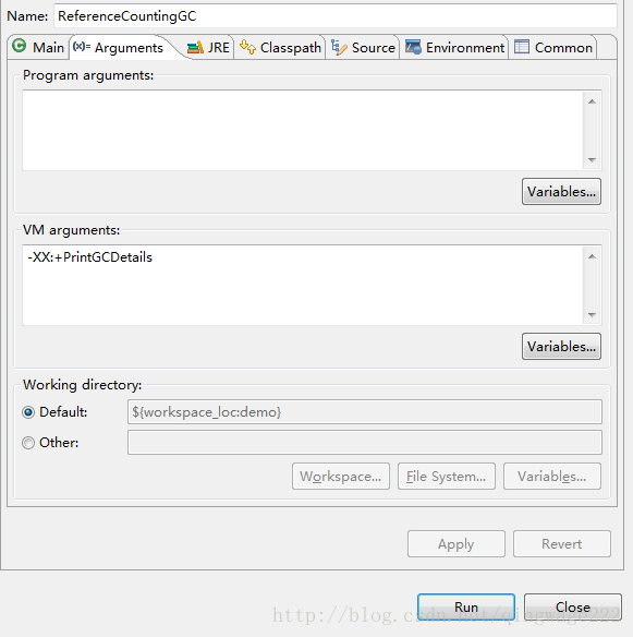 } 在<<深入理解java虚拟机>>的书中,没有给出main方法,因此需要我们自己写出main方法。并且在eclipse 的run ——>run configuration中配置相应的打印日志的方法。有以下四种输出方式: