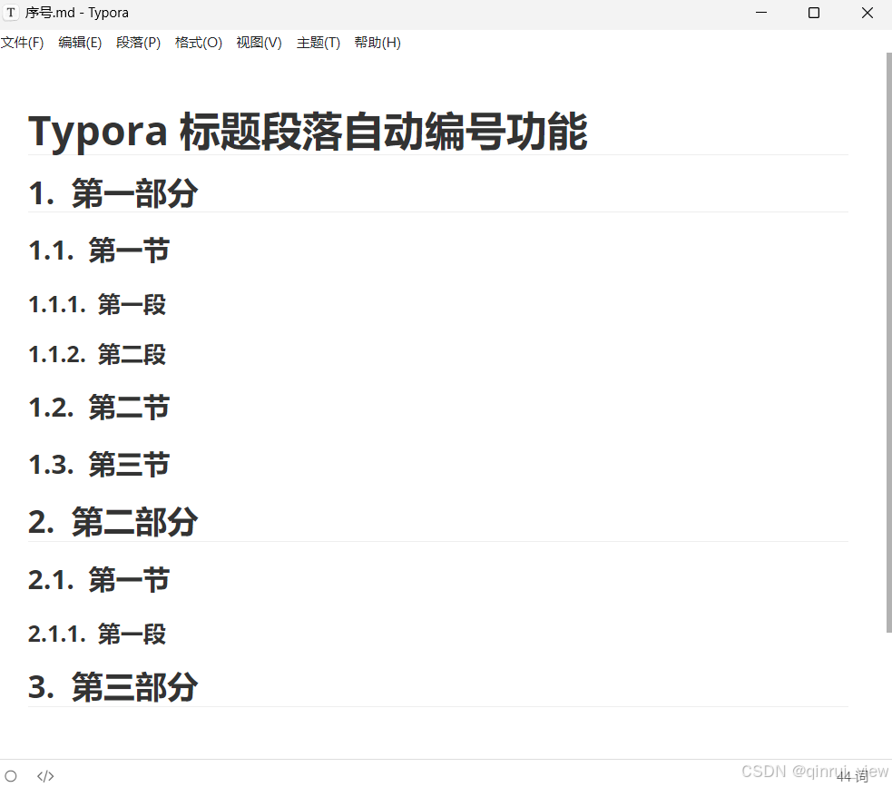 ,然后在正文中依次使用二级、三级标题等。自动编号是从二级标题开始的。一级标题是主标题,只应该有一个,也不应加上编号。Markdown使用# ## ### #### ##### ###### 可以生成标题,但没有序号.5.使用文本编辑器打开新建的文件,下拉光标到文件最后一行,4.当前路径下粘贴文件,并更改文件名,文件名不能含中文。3.复制目录中自己使用的主题(主题以*.css结尾)7.重启Typora,在外观中选择自己新建的主题。文章必须有主标题,且必须是一级标题“2.选择外观,点击打开主题文件夹。