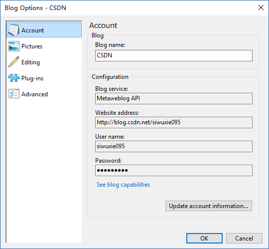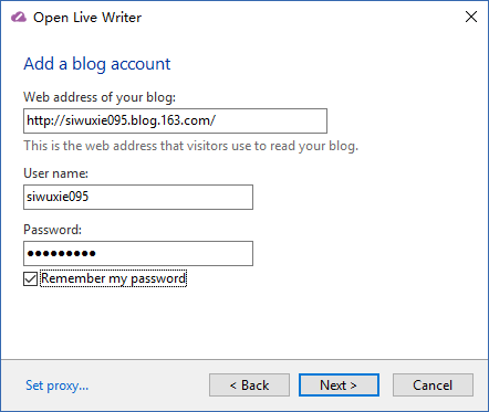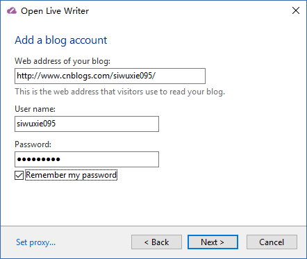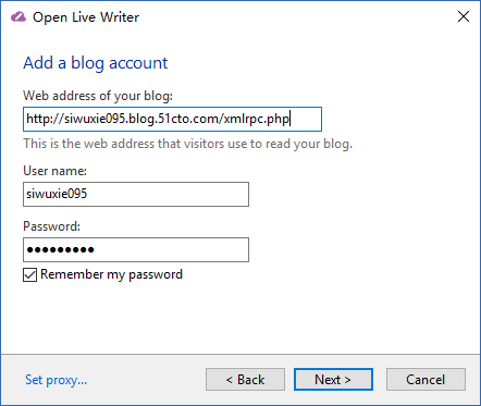 (3)填写“博客地址”、“用户名”、“密码”