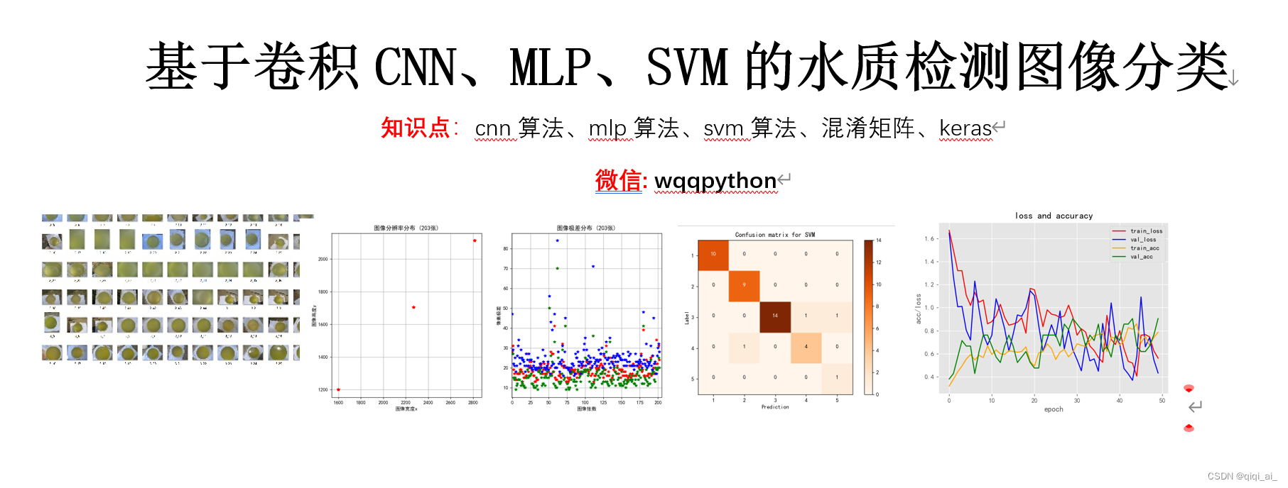 这篇博客通过卷积神经网络(CNN)、多层感知机(MLP)和支持向量机(SVM)进行水质检测图像的分类。作者详细讲解了cnn算法、mlp算法和svm算法,并使用混淆矩阵进行模型评估。提供了完整的代码和数据资源,包括数据展示、环境配置以及珍贵的图像分类检测数据集。