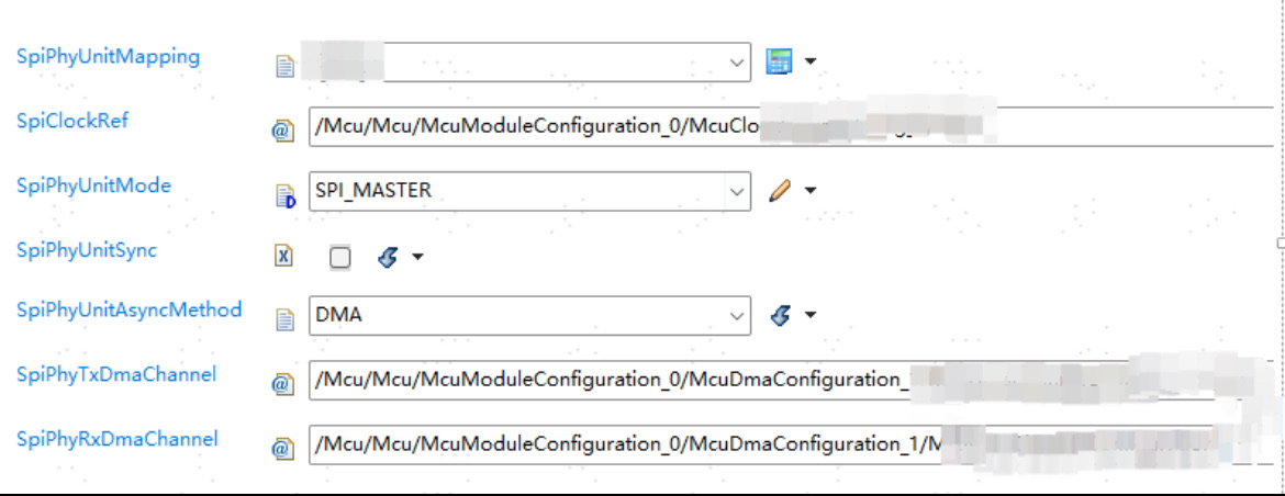 如果选择了DMA传输方式,需要将SpiPhyTxDmaChannel和SpiPhyRxDmaChannel关联到MCU模块里面McuDmaChannelConfiguration。