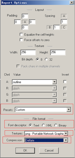 7 设置导出选项,在BMFont上找到Option菜单,然后选择Export options,在cocos2d-x中需要按如下设置