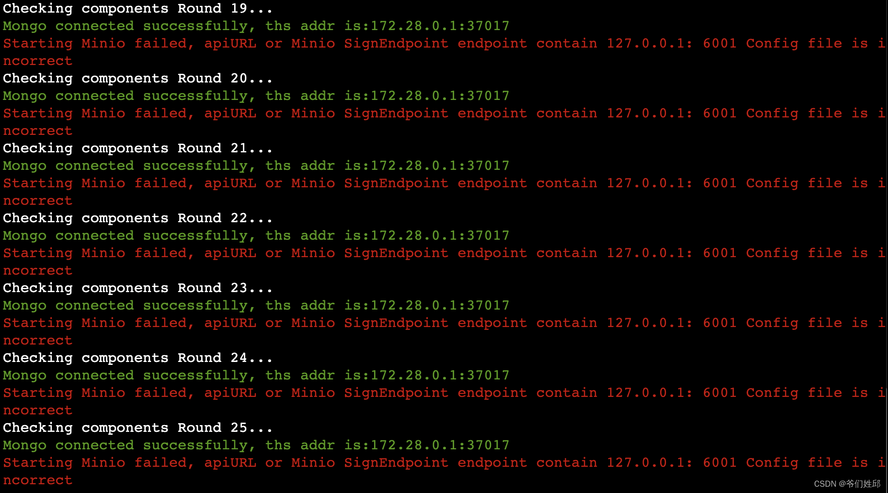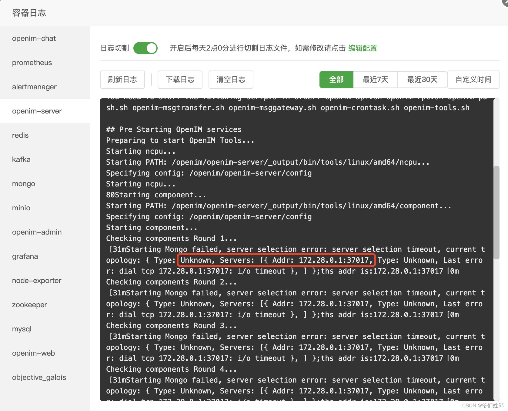 此时查看openim-server的log发现,终于进行到了Starting component的下一步,此时报的错误是容器内互相访问失败: