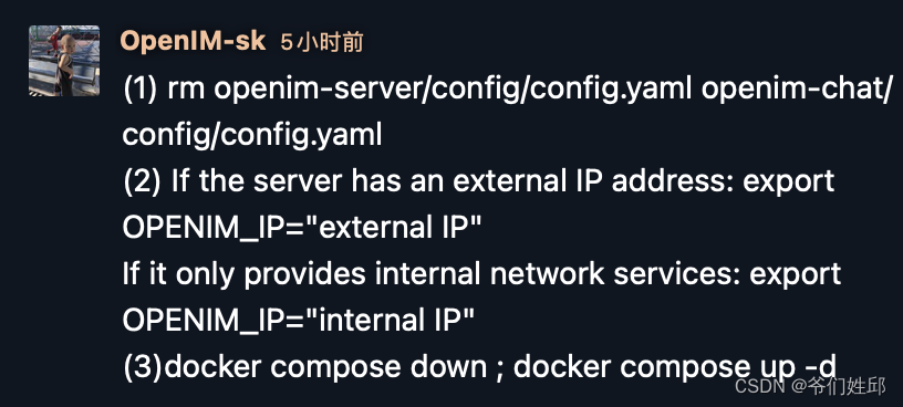 经smile和OpenIM-sk提醒,需要重配一下OPENIM_IP,删除一下两个生成的配置文件: