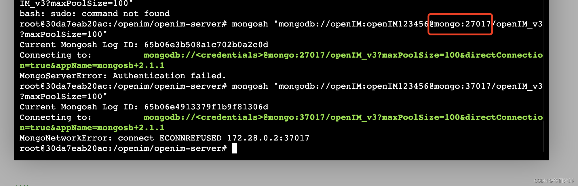版本升级后,发现依然不通,此时经OpenIM-sk大神提示,使用mongosh在openim-server中进行测试: