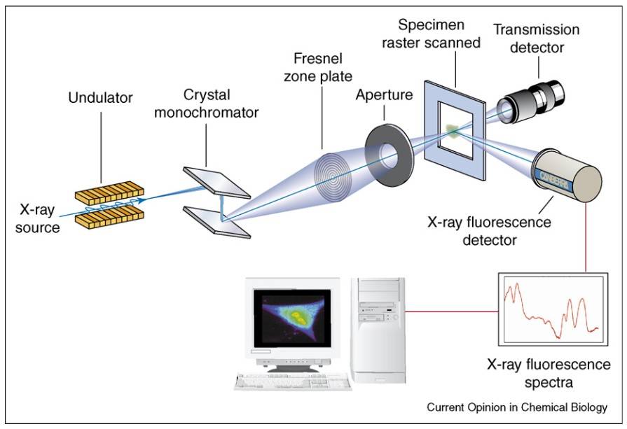 图2:X射线荧光显微镜组件示意图。晶体单色器用于选择入射X射线束的能量,该光束通过菲涅尔区板聚焦在样品上。发射的X射线由能量色散探测器收集,从而实现同时进行多元素分析。对样品区域进行光栅扫描,即可得到定量元素图谱,如计算机显示器所示。透射探测器的作用是帮助样品在扫描台上定位。