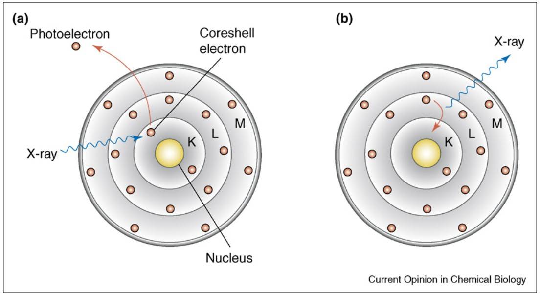 图 1:玻尔原子模型,展示了 X 射线荧光的基本原理。(a)X 射线激发导致核壳层电子从原子中逸出。(b)产生的空位由更高壳层的电子填充,这一过程导致发射一个光子,其能量等于参与跃迁的两个壳层的结合能之差。