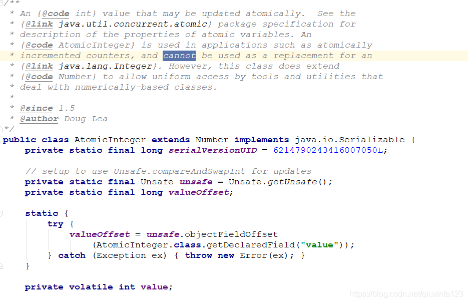 根据注释说明,可以大概知道,AtomicInteger主要用来解决类似于自动递增的计数问题,它并不能替代Integer类。注意到,它有一个成员属性 value,并且是用volatile修饰的,从而保证了可见性。