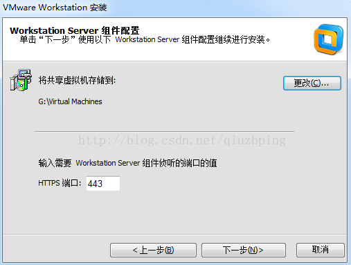 下载Vmware Workstation 10.0虚拟机软件,点击运行,到WorksationServer组件配置的时候如图:最好不要修改Workstation Server组件侦听端口号,保持默认值:443.