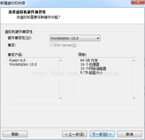 进入选择虚拟机硬件兼容性界面,默认是选择Workstation10.0