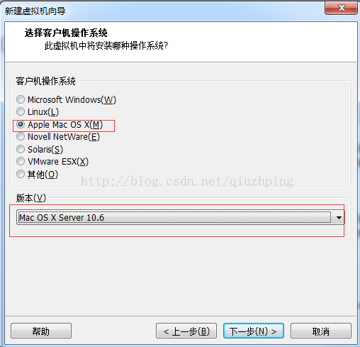 进入选择客户机操作系统界面,选择Apple Mac OSX(M),对应的版本就是你想要安装的Mac OS X Server 版本,我这里安装的是Mac OS 10.6的
