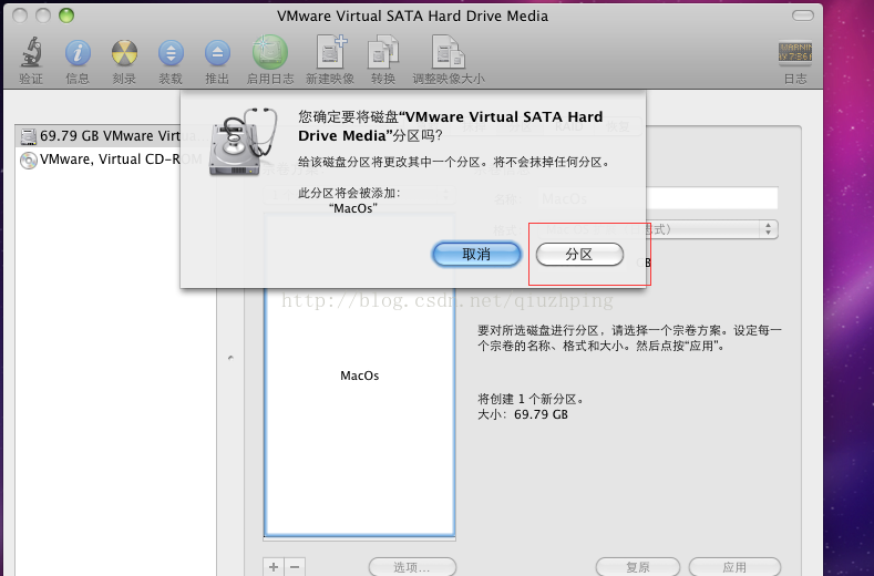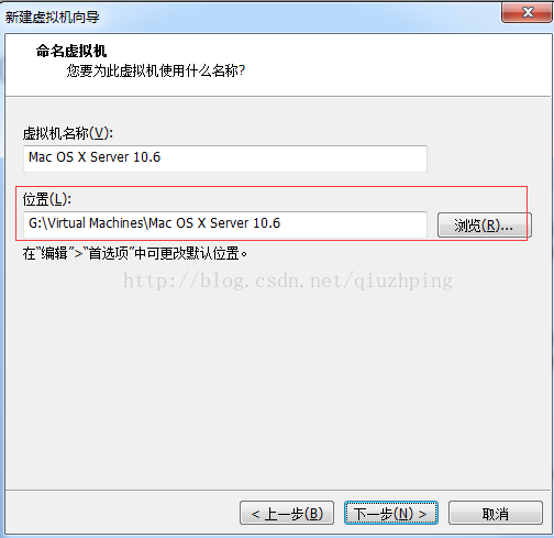 虚拟机的名字可以随意取任意合法的名字,我这里使用的是默认的虚拟机名字,包括版本号,这样方便以后安装多个Mac OS 而不被误导。位置的最好选择大一点的硬盘分区,虚拟机占用的空间比较大。