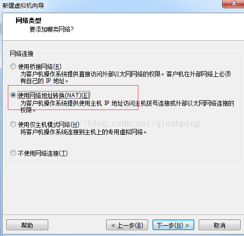 进入选择网络类型界面,以下有四种方式,具体的差别大家可以百度一下就知道了,我通常是选择NAT模式。