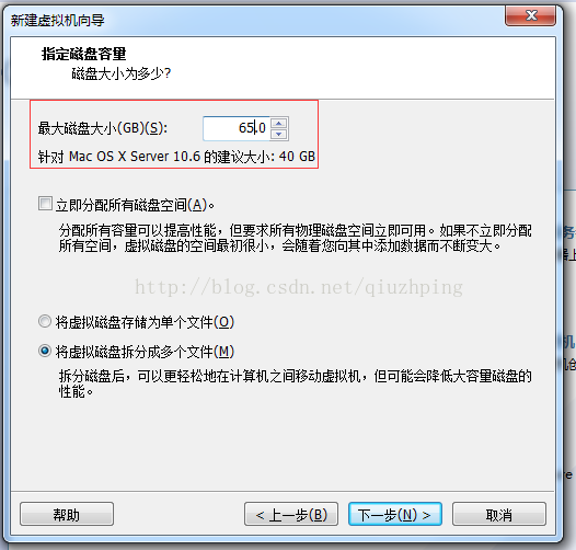进入指定磁盘容量界面,我设置的是65G,大家可以根据需要设置,同时选择将虚拟机磁盘拆分成多个文件。
