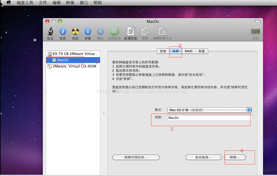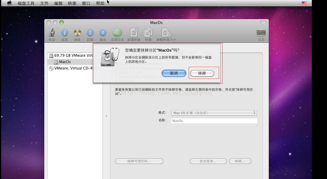 分区完了之后就可以看到MacOs了这个名字是上一部操作命名的,选择抹掉,如图所示。