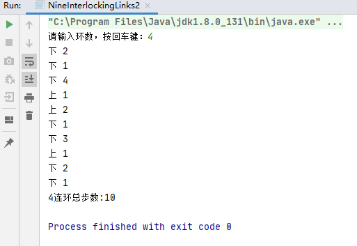 递归算法之九连环操作步骤 import java.util.ArrayList;import java.util.Scanner;/** * 九连环的装卸需要遵守两个规则。 * 1、第一个(最右边)环任何时候都可以装上或卸下。 * 2、如果第k个环没有被卸下,且第k个环右边的所有环都被卸下,则第k+1个环(第k个环左边相邻的环)可以任意装上或卸下。 */public class NineInterlockingLinks2 { private static int numberOfSteps = 0;.