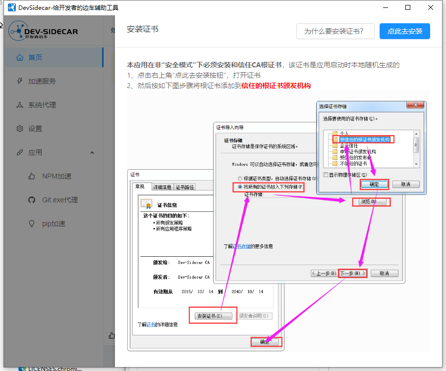 github 加速访问教程(devsidecar) DevSidecar 是一款非常优秀的github加速工具。该软件界面美观,使用后可以给用户带来很多使用帮助和便利,通过本地代理的方式将https请求代理到一些国内的加速通道上,这样的话访问速度就可以更快了。下载后首次运行前会需要让你安装过一个证书,跟着教程安装即可。按照以下步骤安装证书,然后开户相应的代理进行加速了。如果实在访问不了可以在所有github地址前加一个。需要注意的是,如果开启了。