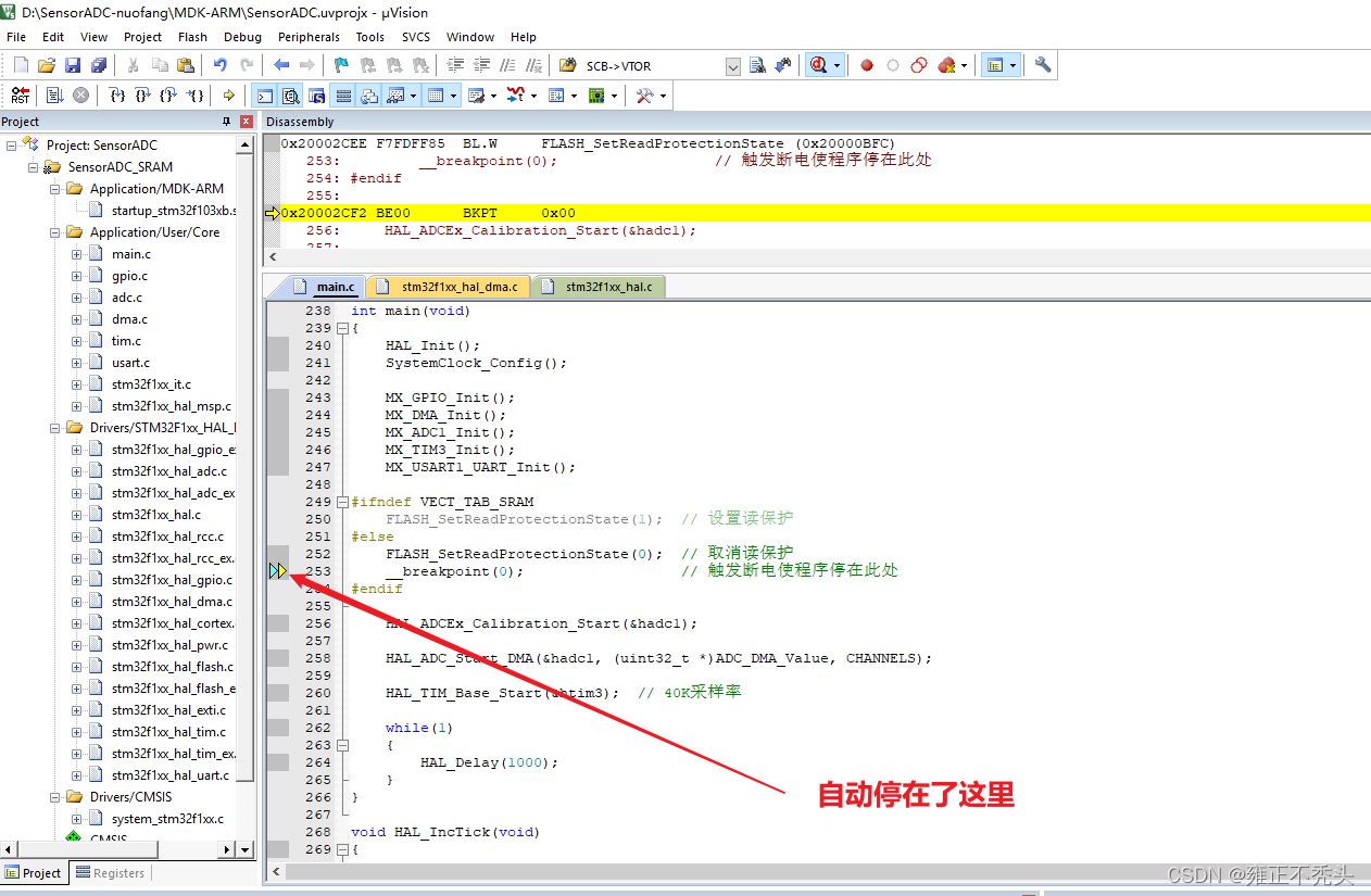 此时,程序应该自动停止在断点处 __breakpoint(0),这说明解除代码已经顺利运行完成!