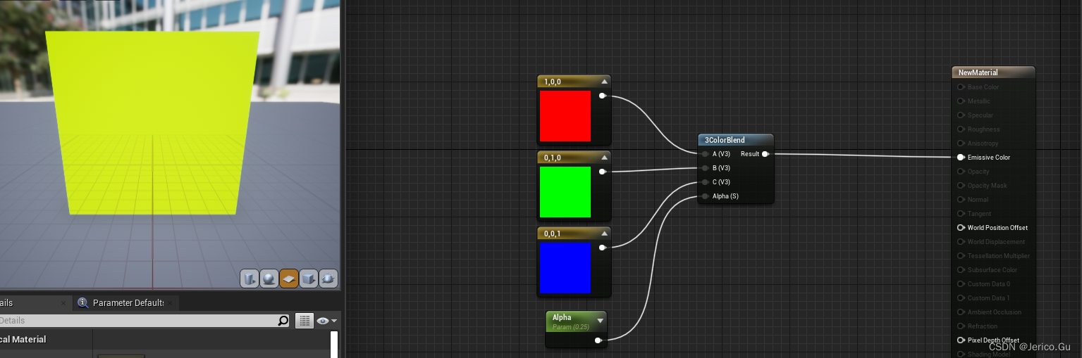 博客介绍了UE4中的颜色混合和线性过渡相关内容。提到Lerp为线性过渡,3ColorBlend是将A、B颜色在0 - 0.5区间混合,B、C在0.5 - 1区间混合,再将两个结果在0 - 1区间混合,若Alpha使用Gradient会出现渐变色,还介绍了Lerp_3Color的混合方式。