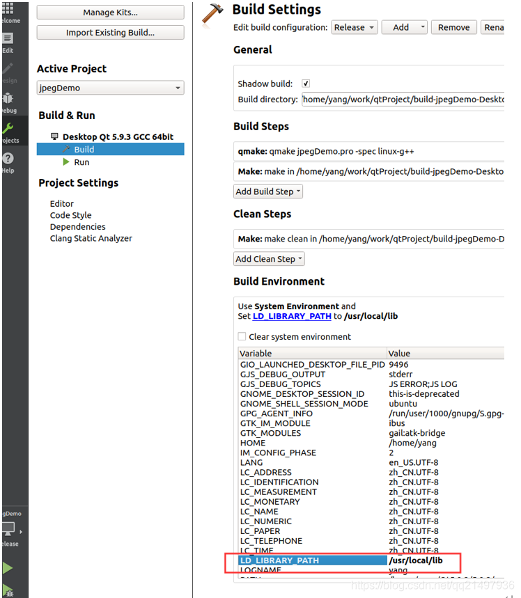 在Qt项目中配置链接库的路径,添加环境变量LD_LIBRARY_PATH(不然会报错,找不到链接库),如下图: