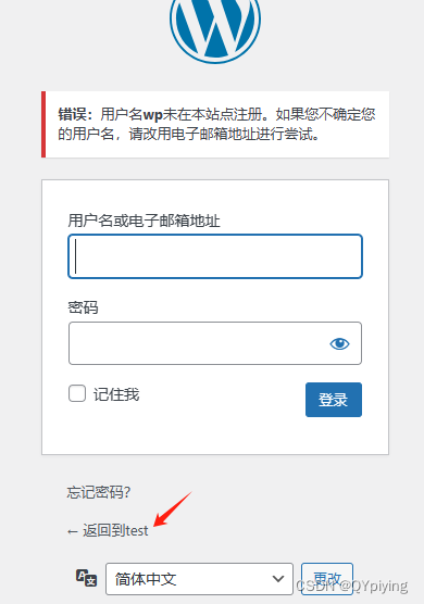 3、点击login.page,使用admin登录,显示错误,用户名未在本站点注册。最后发现下面有个“返回到test”,应该是有“test”用户名,经过尝试得到用户名和密码都为“test”