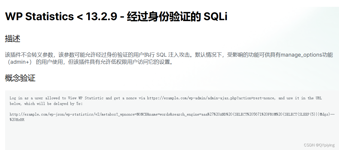 WP Statistics WordPress 插件13.2.9之前的版本不会转义参数,这可能允许经过身份验证的用户执行 SQL 注入攻击。默认情况下,具有管理选项功能 (admin+) 的用户可以使用受影响的功能,但是该插件有一个设置允许低权限用户也可以访问它。