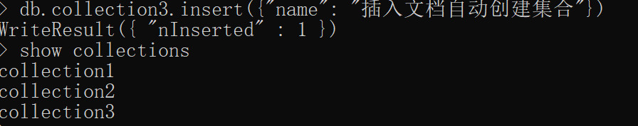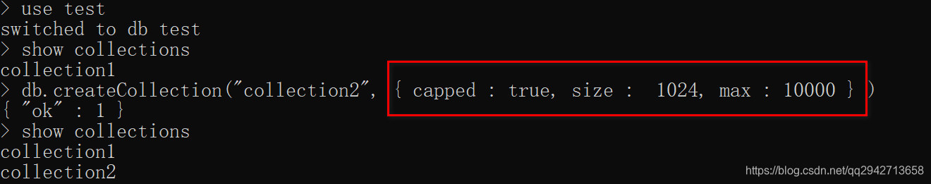 options参数:capped如果为true则创建固定集合(有着固定大小的集合);size为固定集合指定一个最大值,如果capped为true需要指定该字段;max 指定固定集合中包含文档的最大数量