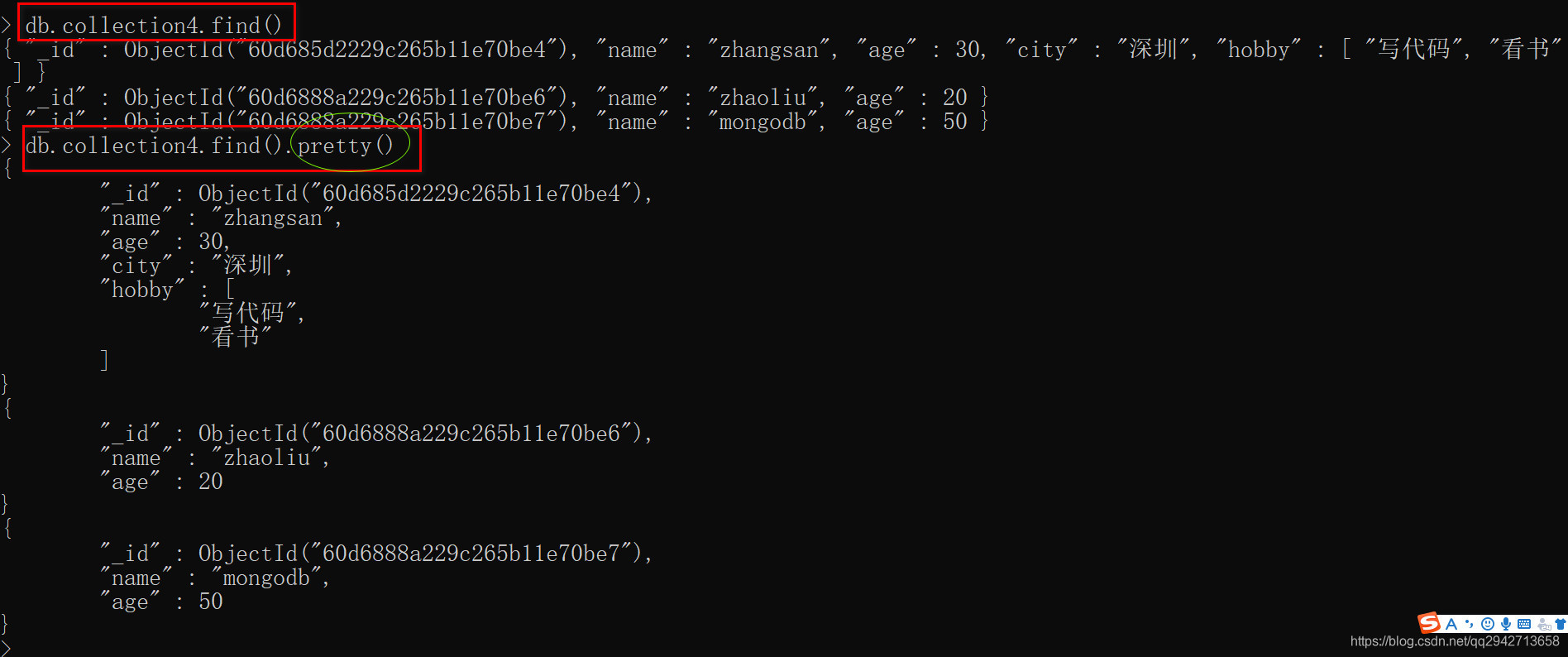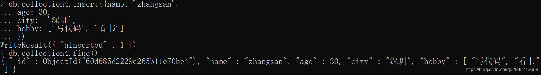 - projection :可选,使用投影操作符指定返回的键。查询时返回文档中所有键值, 只需省略该参数即可(默认省略)。