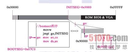 从图1-6中我们已经了解到当时CS的值为0x07C0,执行完这个跳转后,CS值变为0x9000 (INITSEG),IP的值为从0x9000(INITSEG)到go: mov ax, cs 这一行对应指令的偏移。换句话说,此时CS:IP指向go: mov ax, cs这一行,程序从这一行开始往下执行。图1-7形象地表示了跳转到go: mov ax, cs这一行执行时CS和IP的状态,如图右下方所示。