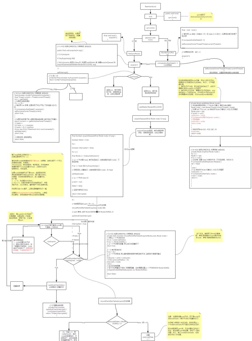 此处是我分析 JDK 源码画的 AQS 源码解析流程图,可以带你很好的理解关于非公平锁和可重入锁内部具体实现。