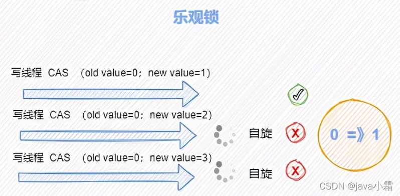如图,原本共享变量 old value=0 ,线程修改数据先比较内存中的值是否为0,若为0,代表没有线程占用,此时才修改为 new value=1,当其他线程到达,发现内存值与 old value 不一样了,便自旋等待。