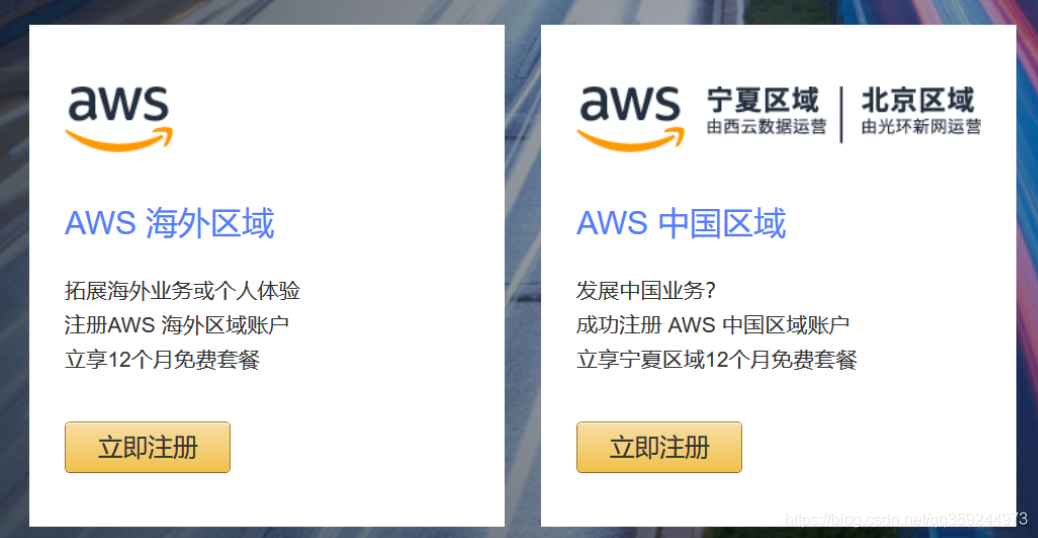 2. 打开网站后,AWS一共给我们提供了两个入口,一个是海外区域,一个是中国区域。截至到2020-08-21,中国区域注册时仍然需要提供一些公司相关的信息,所以我没有注册成功。