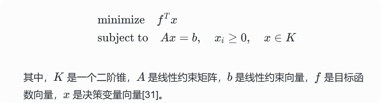 二阶锥规划(SOCP)是一种凸优化问题,通过在有限个二阶锥的笛卡尔积的仿射子空间上最小化或最大化一个线性函数来求解。其标准形式为:
