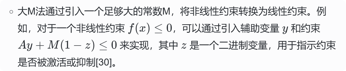 - 优势:大M法能够将复杂的非线性优化问题转化为标准的混合整数规划问题,使得求解更加高效和可靠。此外,该方法在处理多阶段优化问题时也表现出较好的适用性[26]。