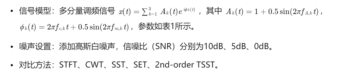 - 噪声鲁棒性:低信噪比下,时频能量聚集性易受噪声干扰,导致瞬时频率轨迹偏移。