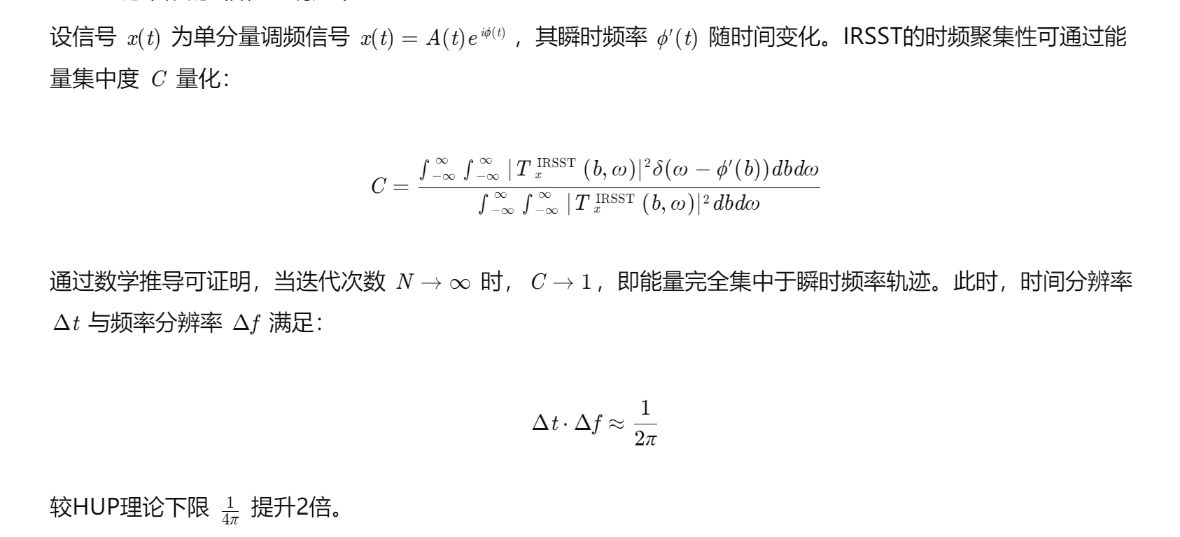 IRSST通过交替进行挤压与重新分配,逐步消除时频模糊性,同时保留信号重构能力。其时频分辨率可逼近HUP理论下限的2倍,证明如下: