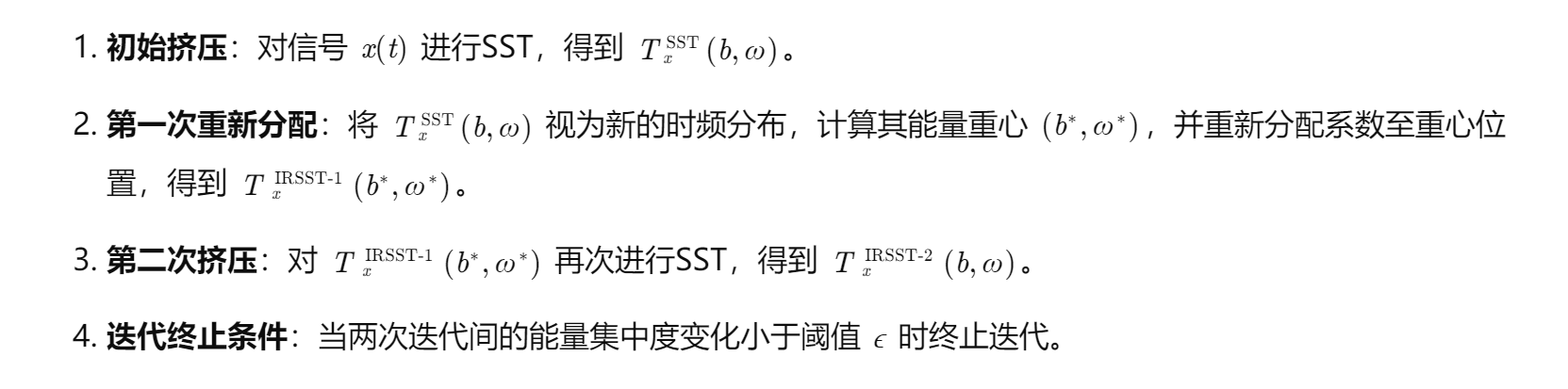 本文提出将SST与RM结合,构建迭代重新分配同步挤压变换(Iterative Reassigned Synchrosqueezing Transform, IRSST),其数学表达式为:
