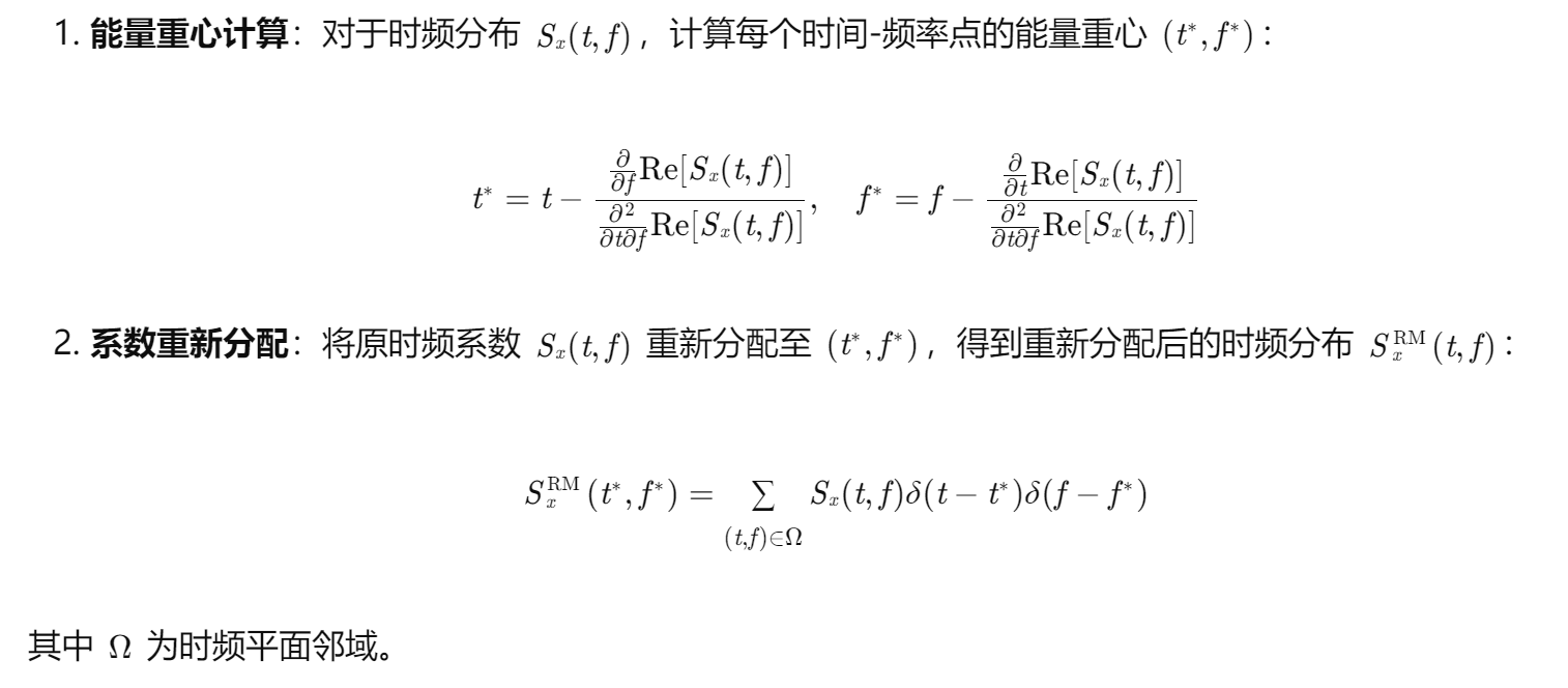 重新分配方法(Reassignment Method, RM)通过将时频系数重新分配至能量重心位置,进一步优化时频表示。其核心步骤如下: